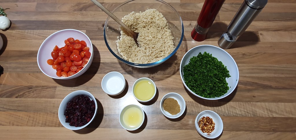 Tabbouleh (or tabbouli) is a simple mediterranean salad mainly comprised of whole grains, tomatoes and parsley. There are many versions of this salad out there but this one is by far my favourite and simplest. The freshness from the lemon juice and veg pairs really well with a heavy main dish such as a roast lamb. It’s also pretty good as a topping in wraps!