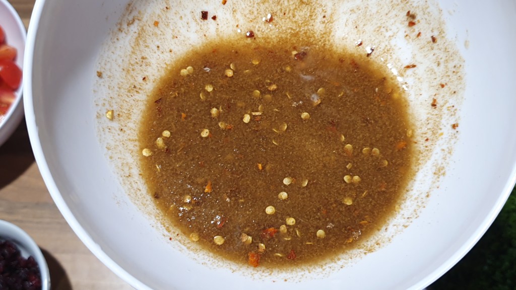 - Make the salad dressing by combining all the dressing ingredients together (olive oil, lemon juice, cumin, salt, red pepper flakes) and whisk until incorporated. Set aside.