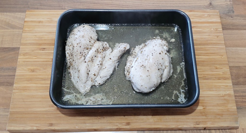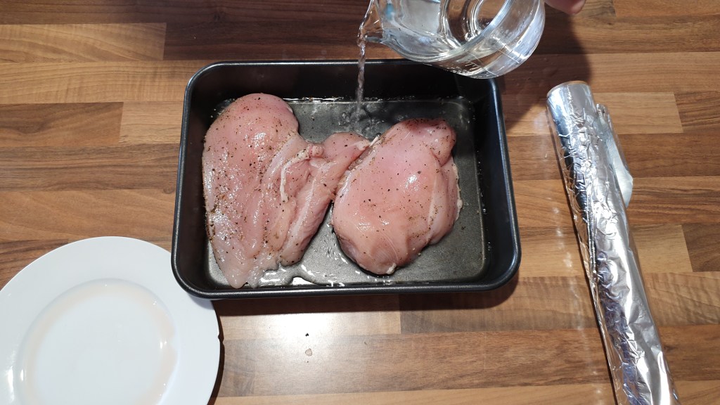 - Pour 1 cm of water into the pan (it doesn’t have to be exact) and cover the tray with aluminum foil. Make sure the edges are sealed (otherwise steam will escape while baking and could result in a dry chicken). Bake in the oven on the middle rack for 20-30 minutes. You can check the doneness of the chicken by either cutting the thickest part and if the juices run clear, it’s finished. If it’s pink, then put the foil back on and bake for another 5 minutes. Alternatively you can use a thermometer and poke it into the thickest part of the breast until it reads 65˚C.