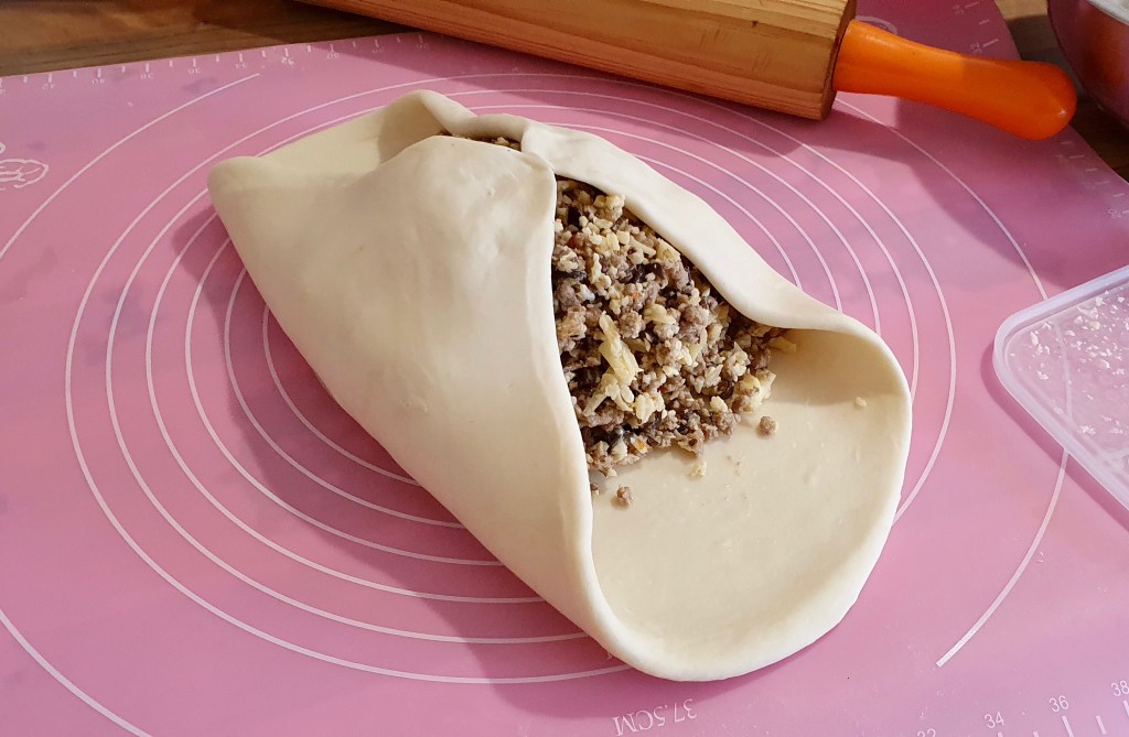 - Assemble: Once the filling has cooled and the dough has rested, assemble the paratha. Make sure you have a large pan 30cm wide that the paratha will fit in. If not, divide the dough into half or quarters and make multiple small stuffed parathas. Roll out the dough into a flat circle about 7mm thick. Mix the shredded cheese with the pork filling and pour the contents into the centre of the dough. Bring the edges of the dough together over the filling to form a ball, try to squeeze out any air pockets before you seal it. Make sure the top is sealed well. Gently press down on the dough ball to flatten it and then use a rolling pin and carefully flatten the ball in all directions until roughly 1cm thick. You may be able to see the filling just under the dough.