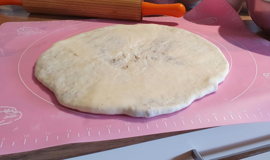 Assemble: Once the filling has cooled and the dough has rested, assemble the paratha. Make sure you have a large pan 30cm wide that the paratha will fit in. If not, divide the dough into half or quarters and make multiple small stuffed parathas. Roll out the dough into a flat circle about 7mm thick. Mix the shredded cheese with the pork filling and pour the contents into the centre of the dough. Bring the edges of the dough together over the filling to form a ball, try to squeeze out any air pockets before you seal it. Make sure the top is sealed well. Gently press down on the dough ball to flatten it and then use a rolling pin and carefully flatten the ball in all directions until roughly 1cm thick. You may be able to see the filling just under the dough.