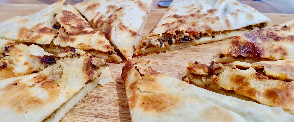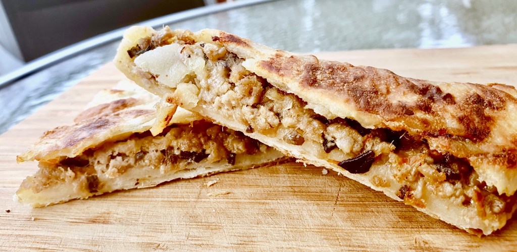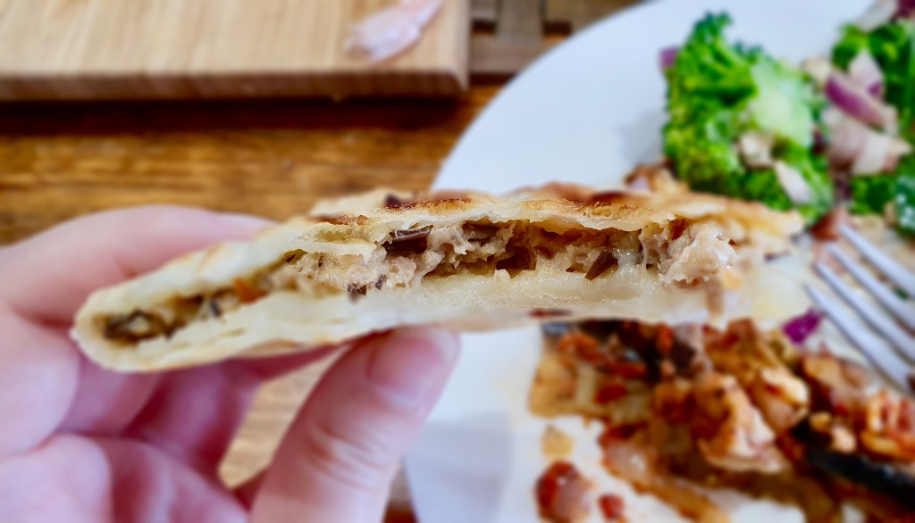 Have you ever made too much filling for the amount of wrappers you have and didn’t know what to do with it but don’t want to throw it away? This happens to me more often than I would like to admit. Dumplings. Spanakopita. Curry puffs. Ravioli. Well get ready for the solution to all your leftover fillings: stuffed parathas! I got this idea from El Mundo Eats where I’ve had their Chicken Keema Paratha recipe saved on my “to make” list for ages. I didn’t have any chicken mince on hand, but I did have some leftover pork mince from making spring rolls last week and also homemade Thai red curry paste that I’ve been meaning to experiment with more. An hour later, this delicious creation was born! The pork filling tastes just like a Thai red curry with the use of my homemade red curry paste and coconut milk. I also added cheese to mellow out all the flavours and to help everything stick together more. I wish I took more photos of the process but I was just playing around in the kitchen and didn’t actually expect this to turn out sooo good! It’s kind of like a quesadilla but with more bread and less messy to eat. You can serve it with any kind of dipping sauce you like or eat it on its own. You could even make a sweet version!