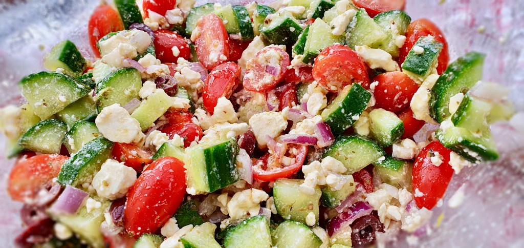 - Assemble the salad by mixing the rest of the ingredients into a large bowl: tomatoes, cucumbers, red onion, feta, oregano, and olives.