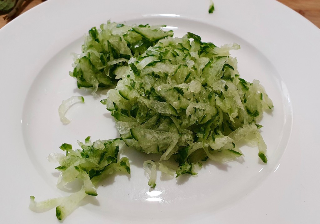 - Grate the cucumber (with the peel) and then wrap it up in a clean tea towel or a few layers of paper towel and squeeze out as much liquid as you can. You should end up with nearly half the weight of cucumber you started with.