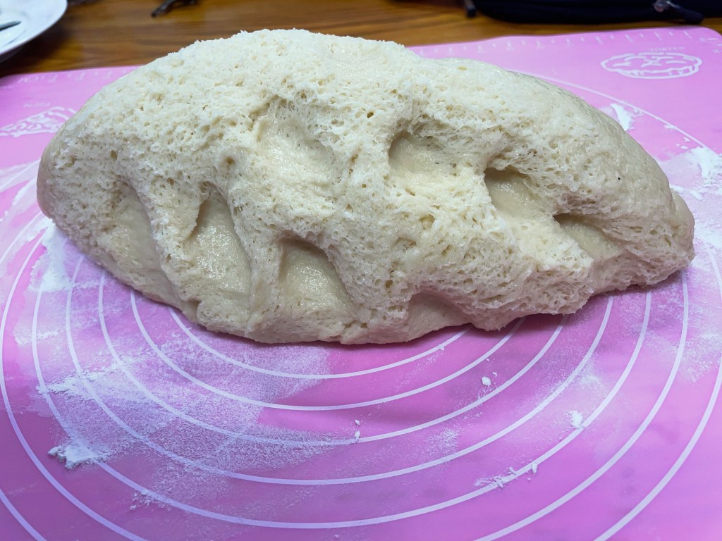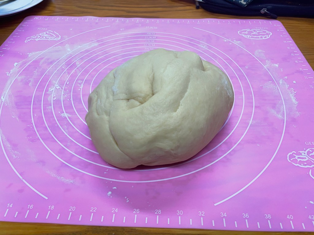 - Assemble the roll: After the dough has doubled it size, knead it out on a lightly floured surface to get the air pockets out. Divide the dough in half. Using a rolling pin, roll out one dough ball into a square until you get a rectangle about 2-3mm thick.