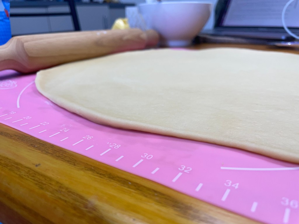 Using a rolling pin, roll out one dough ball into a square until you get a rectangle about 2-3mm thick.