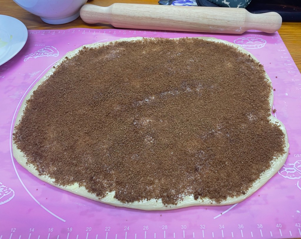 - Spread half the softened butter over the dough and then sprinkle half of the cinnamon-brown sugar mixture on top. Use your rolling pin to lightly roll over the dough so the cinnamon sugar is gently pressed in.
