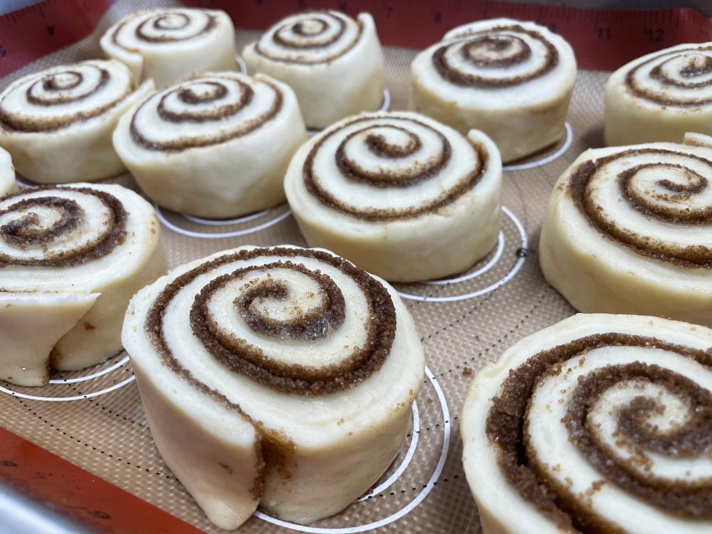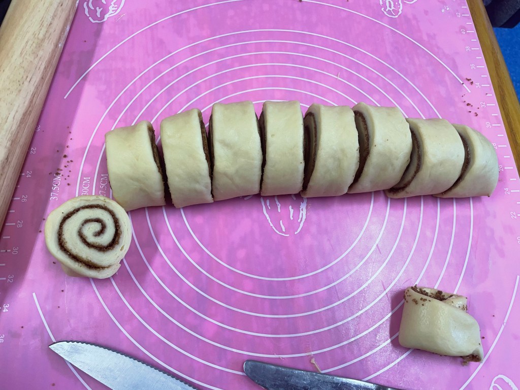 - Roll up the dough semi-tightly from left to right so you’re left with one long roll. If you find the centre of your roll thicker than the edges, gently roll it out until it is roughly the same thickness. Cut up the dough into even 3cm thicknesses and place on a lined baking tray. Repeat with the other half of the dough.