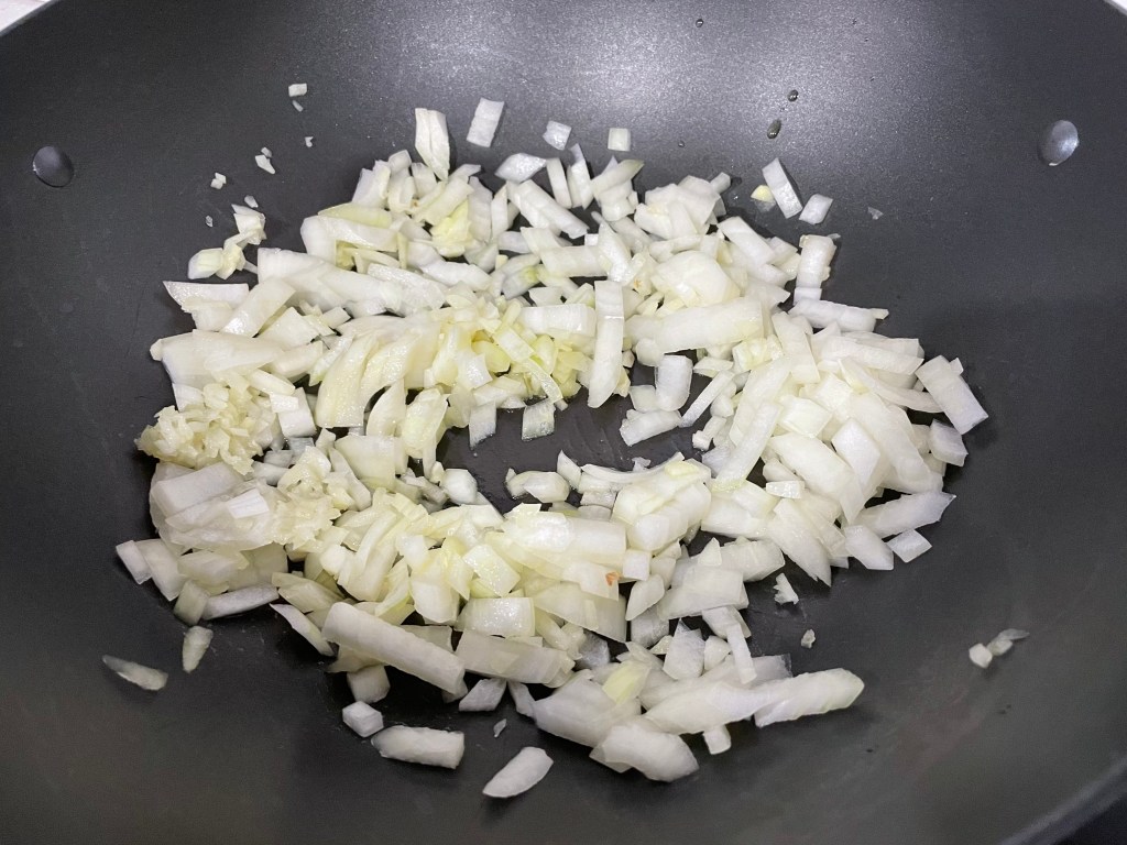 - In a wok on MED-HIGH heat, add a few tablespoons of oil and sauté the garlic, ginger and onion for 30 seconds until fragrant.