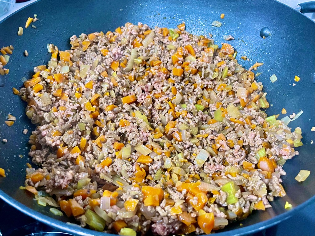 Finely dice all of your veg. Tip: if you’re feeling lazy you can put it in the food processor and pulse it until you get small pieces. If you’re using dehydrated shiitake mushrooms, rehydrate them by soaking them in hot water for 10-15 mins until soft.