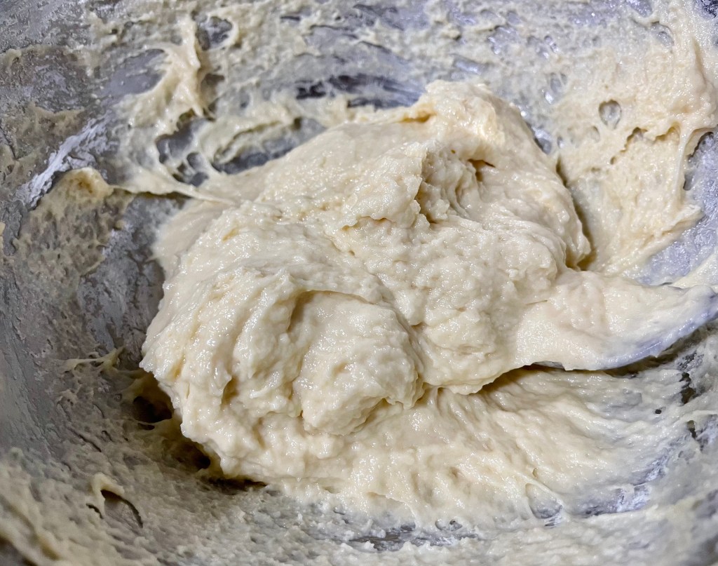 - Add in the flour gradually to the bowl, mixing with a fork, until you get a thick sticky dough – it should be roughly thicker than cake batter (you may not need to use the entire cup of flour). Set aside to rest for 10 mins.