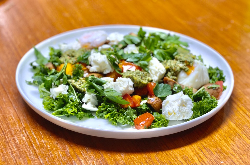 6. Assemble the salad: Divide evenly between 2 large plates: sourdough (if using) + massaged kale + roasted pumpkin/mushrooms/tomatoes + 4-5 spoonfuls of pesto + 4-5 spoonfuls of feta + 2 poached eggs (if using) + sprinkle of flat leaf parsley. Top with fresh cracked pepper. Serve warm!