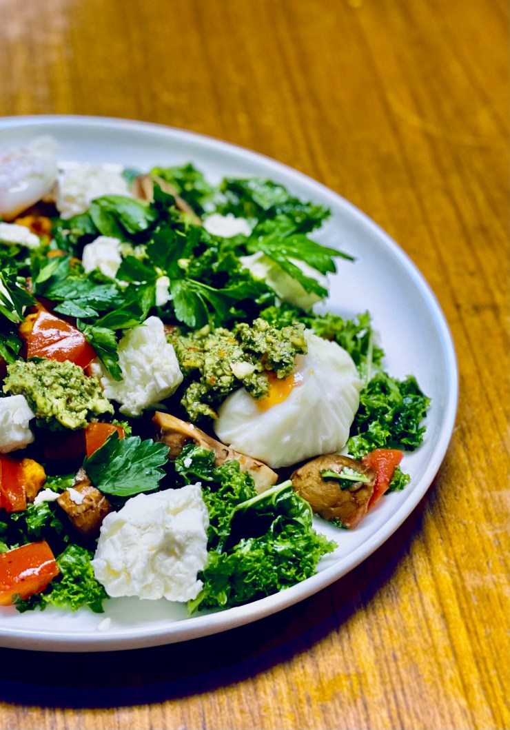6. Assemble the salad: Divide evenly between 2 large plates: sourdough (if using) + massaged kale + roasted pumpkin/mushrooms/tomatoes + 4-5 spoonfuls of pesto + 4-5 spoonfuls of feta + 2 poached eggs (if using) + sprinkle of flat leaf parsley. Top with fresh cracked pepper. Serve warm!