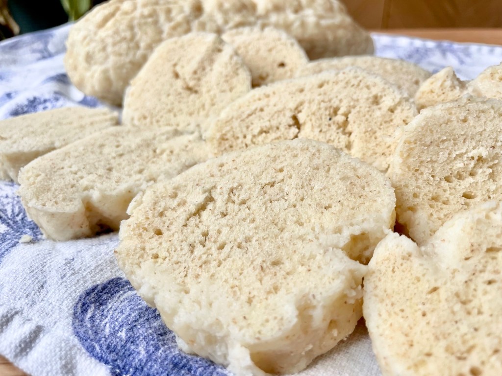 There are a few different kinds of dumplings, but the two most common ones I’ve seen in Czech are the fluffy bread dumplings (houskové knedlíky) and the denser potato dumplings (bramborové knedlíky). The lighter bread dumplings are made with a yeast dough so it’s fluffy but still with a bit of structure and chew and best served with a saucy dish such as svičkova to soak up all the flavours whereas the potato dumplings are much more dense and is more like eating a side dish of potatoes that can balance the richness of a dish such as rajská or sauerkraut. Of the two, the bread dumplings are more commonly seen and you can very easily buy them at the supermarket instead of making them fresh. This recipe is for the bread dumplings. If you want to make the potato dumplings, you can find the recipe here.