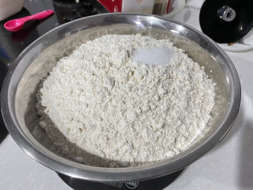1. Microwave the 1.5 cups milk until warm to the touch. Mix in the 1 Tbsp sugar and 1 Tbsp yeast and set aside for ~10 mins until frothy. Once the milk/yeast mixture is frothy, beat in one egg to the mixture.
