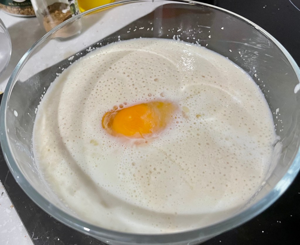 Microwave the 1.5 cups milk until warm to the touch. Mix in the 1 Tbsp sugar and 1 Tbsp yeast and set aside for ~10 mins until frothy. Once the milk/yeast mixture is frothy, beat in one egg to the mixture.