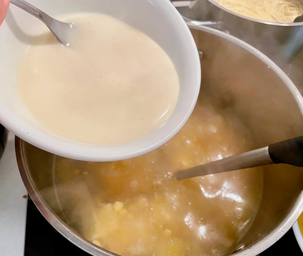 - Take out a few ladles of soup into a bowl and add in the cornstarch. Mix it around until smooth then drizzle it into the soup while stirring continuously (if you don’t stir, the corn starch will clump together). Feel free to add more cornstarch if you prefer a thicker consistency (remember to mix it with soup first in a small bowl, never add cornstarch directly into the soup or else it will clump).