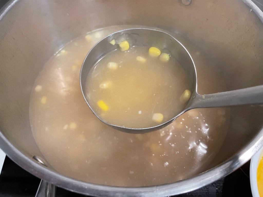 - In a pot on MED heat, bring the chicken broth to a simmer then add in sesame oil, white pepper, sugar and corn. Let it come to a simmer again, then taste the soup and adjust seasonings as needed, salt & pepper to taste.