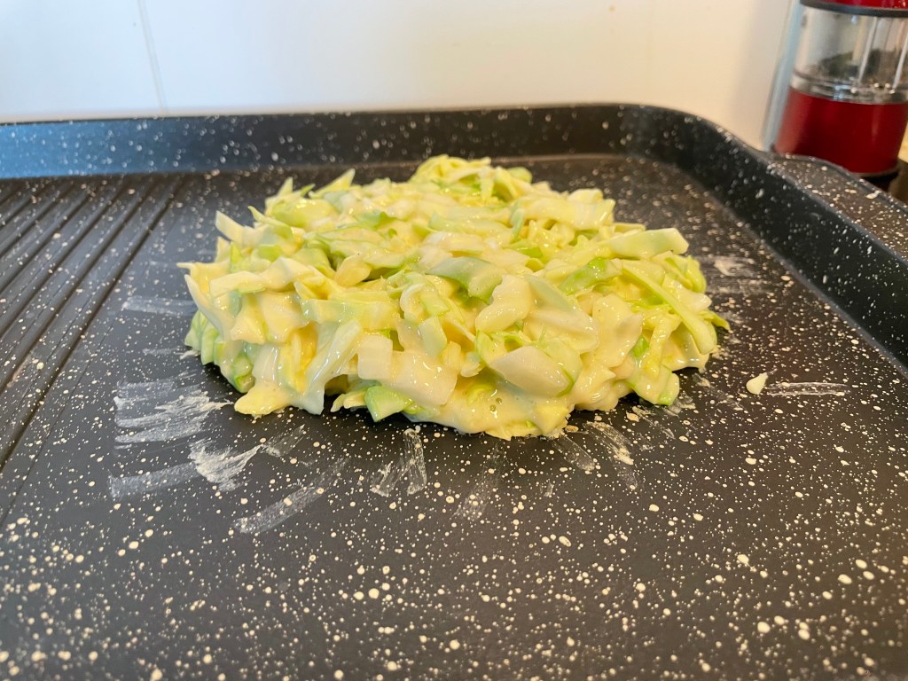In a large bowl mix the okonomiyaki flour with water until you get a smooth paste. Then add in beaten eggs, cabbage and onion. Mix until everything is combined.