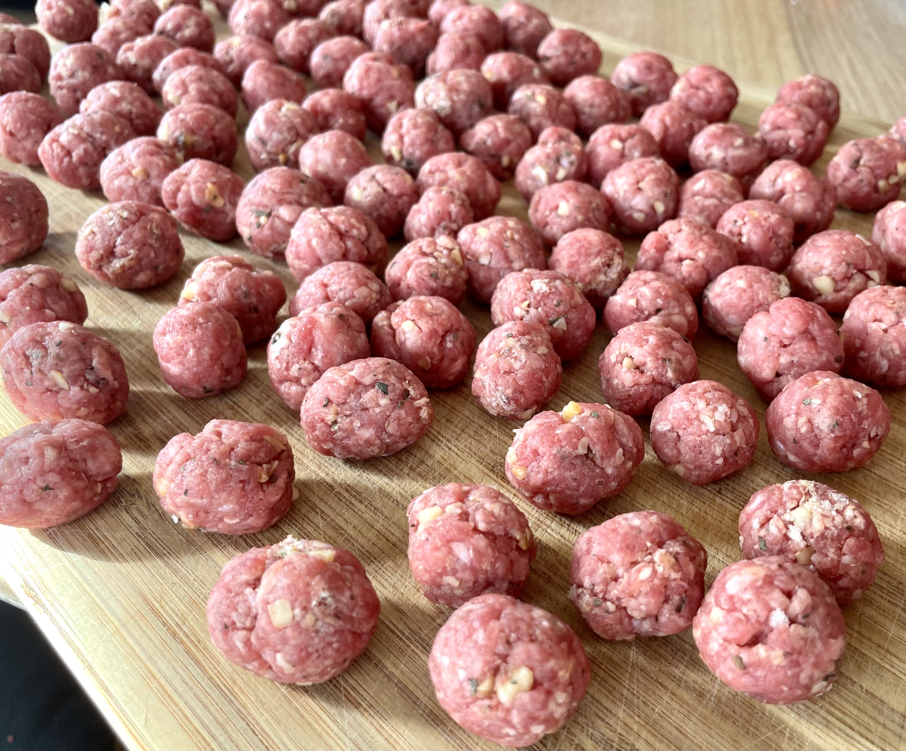 1. Make the meatballs: mix all the meatball ingredients together in a mixing bowl (ground beef, eggs, panko, garlic, onion, parsley, basil, Parmesan, salt, and pepper). Roll them into 2 cm small meatballs.