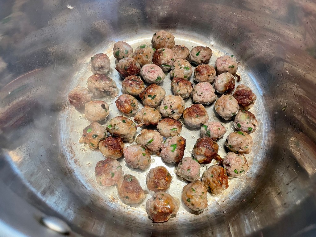 2. Fry off the meatballs (optional but adds more flavour): In a large pot on HIGH heat, add a small amount of oil and fry the meatballs in small batches for 10-15 seconds until browned. You don’t want to cook the meatballs fully, but only enough to sear the outsides to lock in the flavour. Place the meatballs on a plate lined with paper towel to soak up any excess oil. Repeat until all the meatballs are fried off.