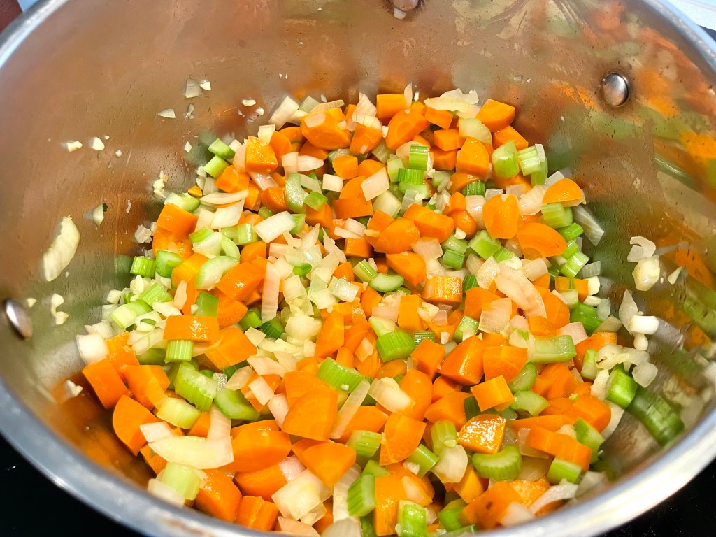 3. Once all the meatballs are fried off, in the same large pot, turn the heat down to MED heat and sauté the onion and garlic in the olive oil and cook until the onion is transparent (~5 mins). Add in the celery and carrot and continue cooking until soft and easy to break apart with a spoon. (You can quicken this process by adding on the lid but be careful not to let it burn.)