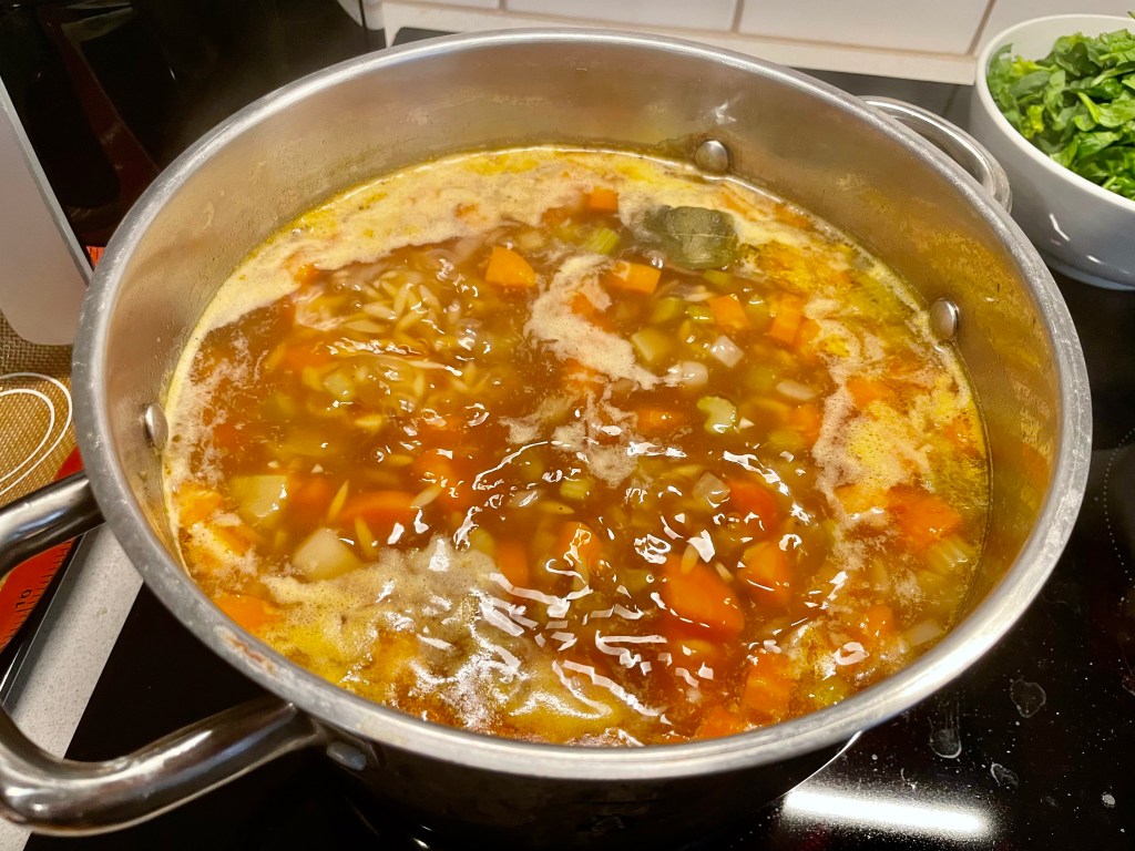 5. After 20 mins, add in the risoni pasta. Boil for 5 minutes then add in the fried meatballs. Continue cooking for another 5 minutes until the risoni is cooked and the meatballs are no longer pink inside. Turn off the heat and add in the spinach. Stir the spinach into the soup until wilted. Salt and pepper to taste. Serve! (Tip: This soup tastes better the next day once the flavours have infused a little more)