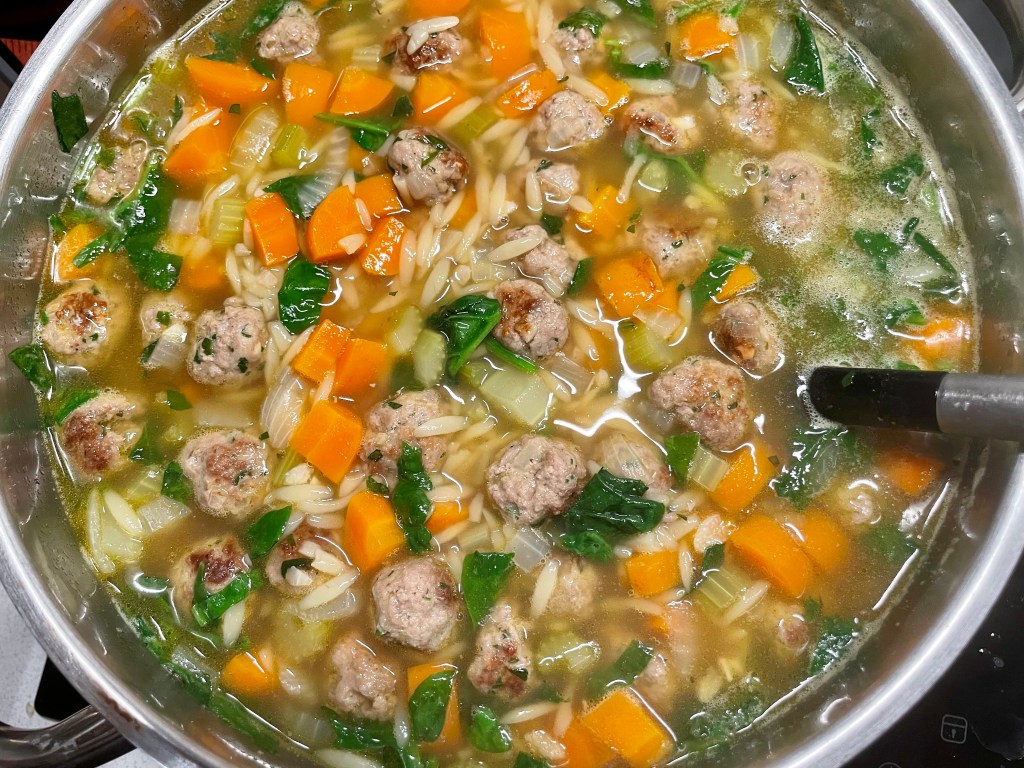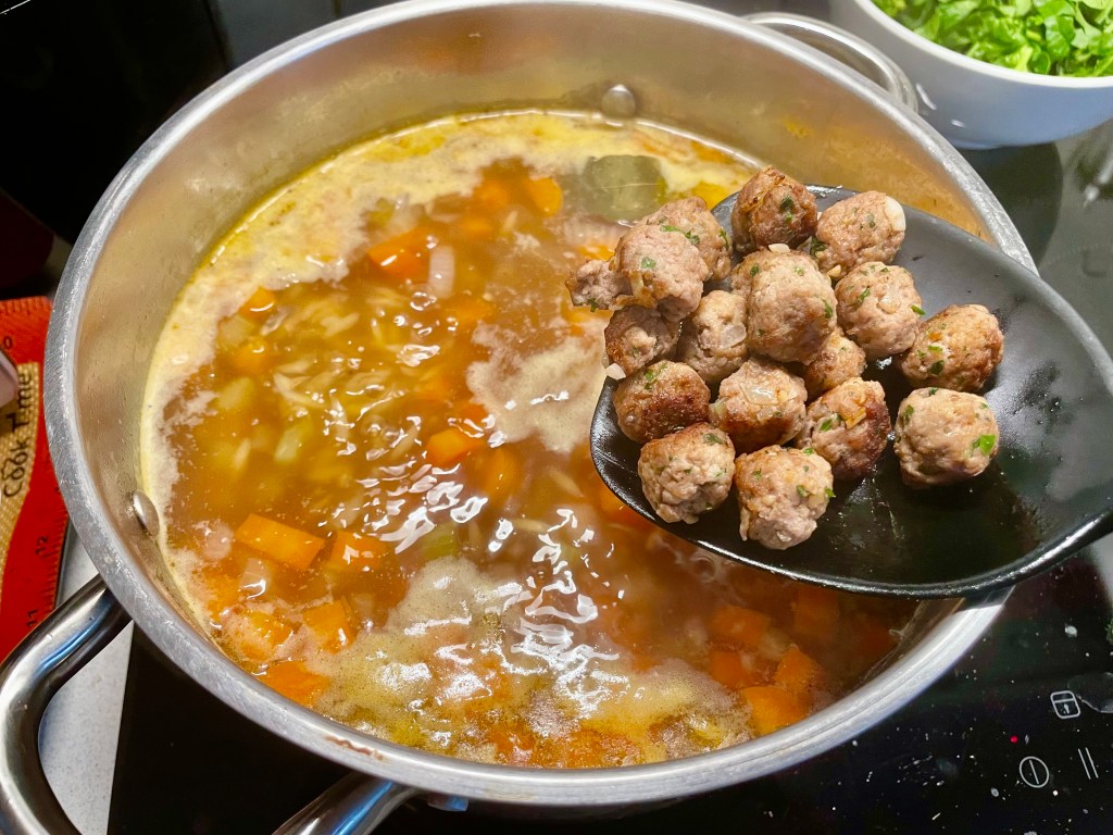 The soup is technically easy to make but it is pretty time-consuming to make the little tiny meatballs. To pass the time faster, I’d recommend grabbing a chair and streaming something in the background while you form the meatballs or recruiting other people to make it with you.