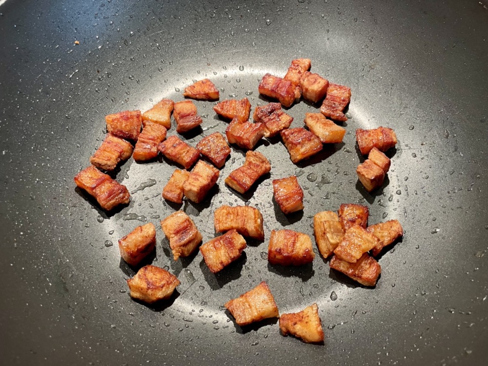 Continuously spoon out the clear oil into a heat-proof bowl as its produced (you don’t want to leave the pork sitting in a pool of oil or else this will start frying the pork). This is a slow process and will take roughly 45mins – 1hr. Be sure to toss the pork pieces occasionally. It’s done when the pork pieces are dried and crispy and no longer rendering fat. Turn off heat.