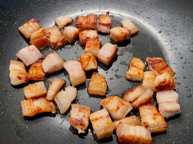 - In a wok on MED-HIGH heat, add in the pork belly and water. After a minute or two, the water will start turning murky and start to evaporate.