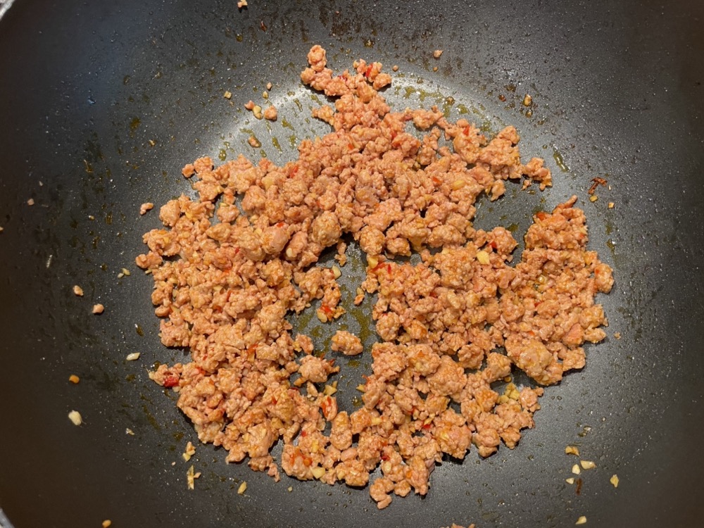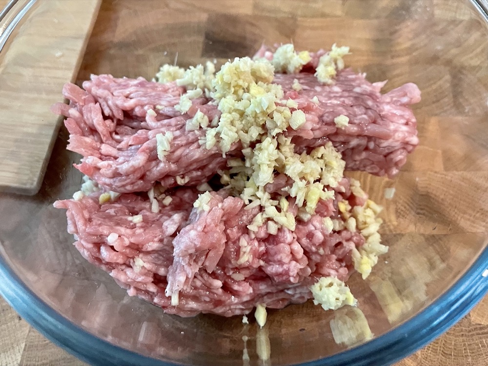 - Mix the ground pork, mirin, and ginger together. Set aside to marinate for 15 mins.