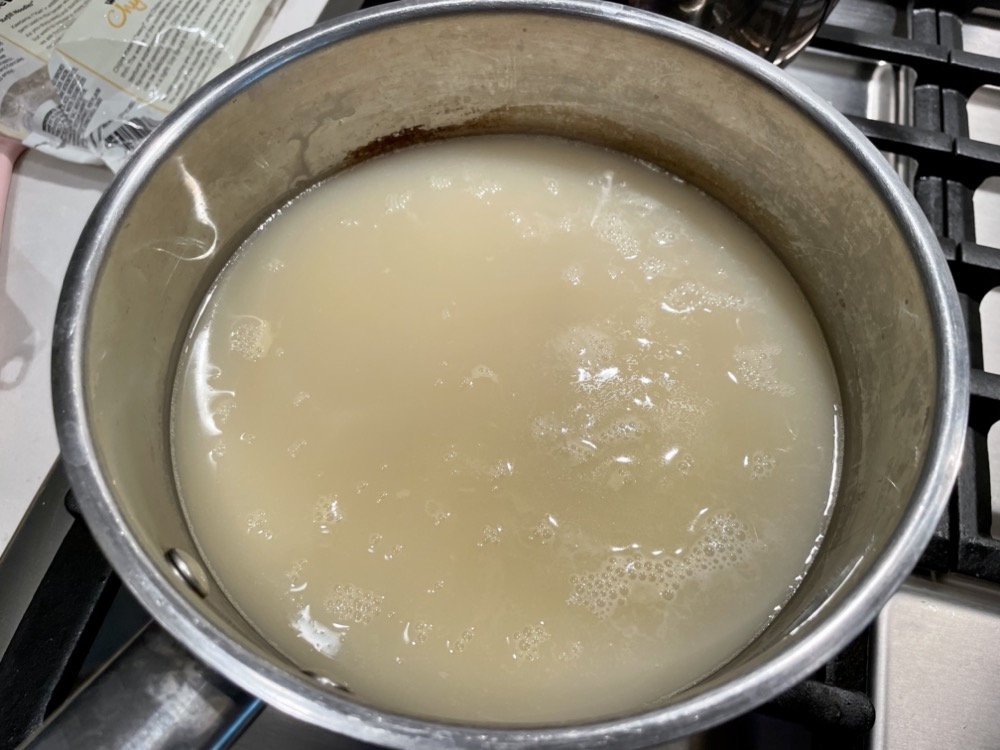 - In a saucepan on HIGH heat, add in the oat milk and chicken stock. Heat it up until it just comes to a simmer then turn the heat to LOW to keep warm until ready to be used. Do not let it get any higher than a small simmer otherwise it may curdle!