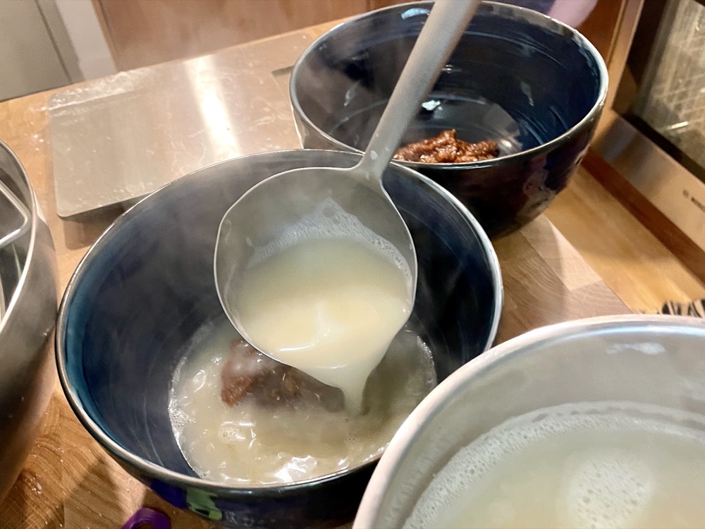 To assemble: Add one ladle of the oat milk/chicken stock mixture into each of the soup bowls over the soup flavour base and mix well until combined. Then evenly divide the rest of the oat milk/chicken stock mixture into each bowl.