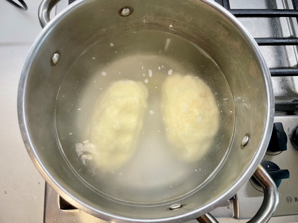 3. Lightly boil a pot of water. Gently lower 2 logs into the water (if you have a small pot, you may want to cook just one at a time to not overcrowd them). Let them boil for 25 – 30 minutes. Occasionally move them around in the water to ensure they are not stuck to the bottom of the pot. They will start to float when they’re roughly halfway cooked. To check if they’re cooked, you can slice off a piece and try it – you should get a dense bread-y texture with a little bounce.