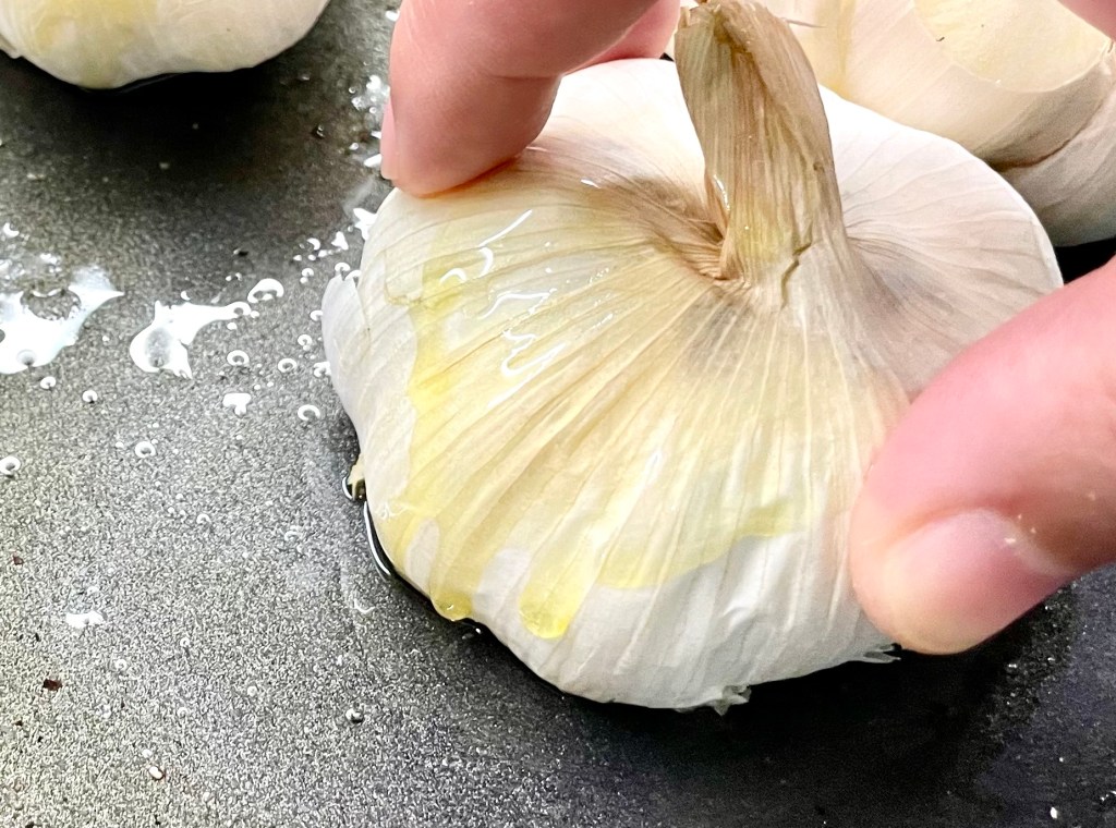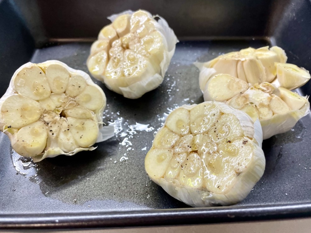 Prepare a small square baking tray and pour in a drizzle of olive oil. Slice the base off of the garlic bulbs (the flat side – see photo) and dip the exposed side into the olive oil and place the bulbs in the tray, cut side up. Sprinkle salt and pepper over top. Make sure all the exposed garlic cloves are covered in oil so it doesn’t burn.