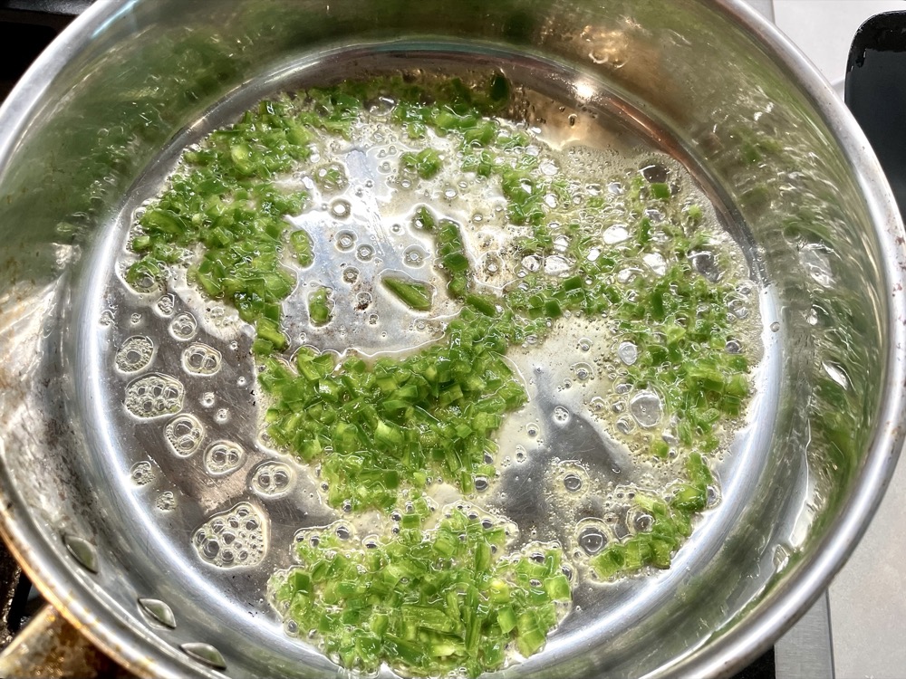 In a skillet on HIGH heat, melt the ghee (or butter/oil). Then add in the green chillies and sautƩ for 2 minutes until starting to soften. Next add in the onions and continue to sautƩ for another 3-4 minutes until the onion softens.