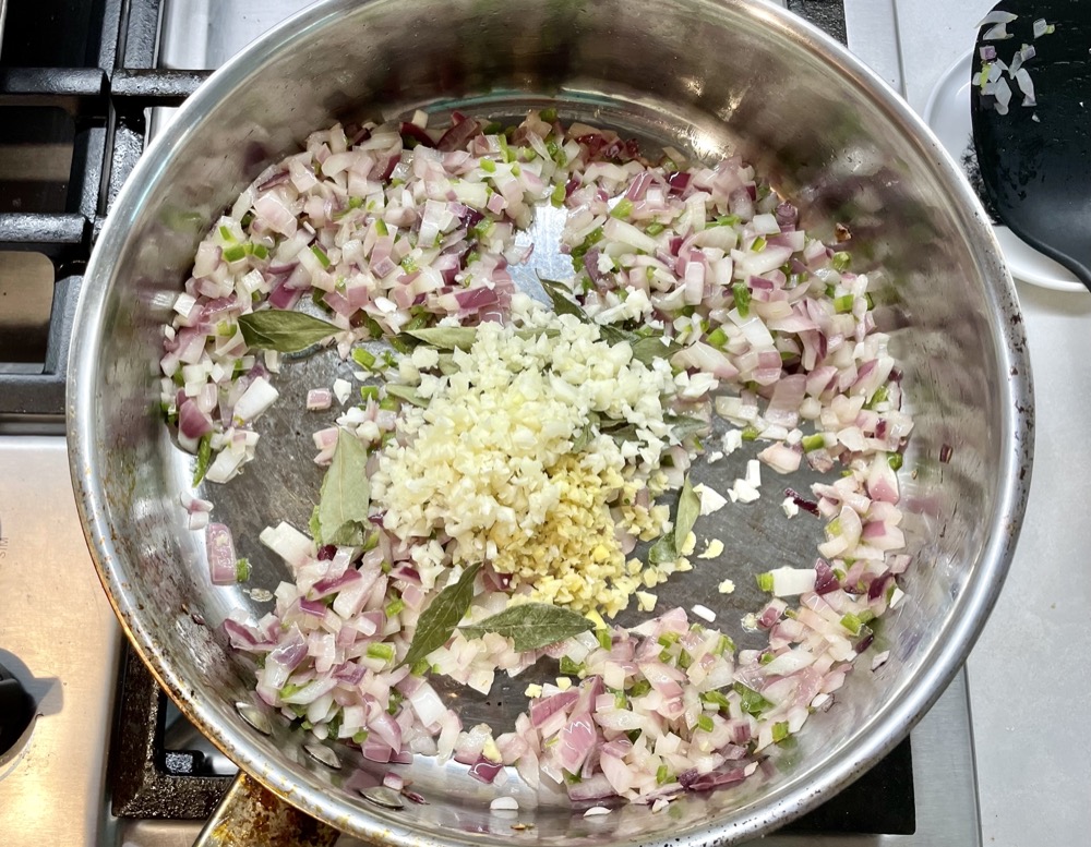 Once the onion has softened, turn the heat down to MEDIUM and add in the minced garlic, ginger, and curry leaves. Cook for 1 minute until the garlic is fragrant.