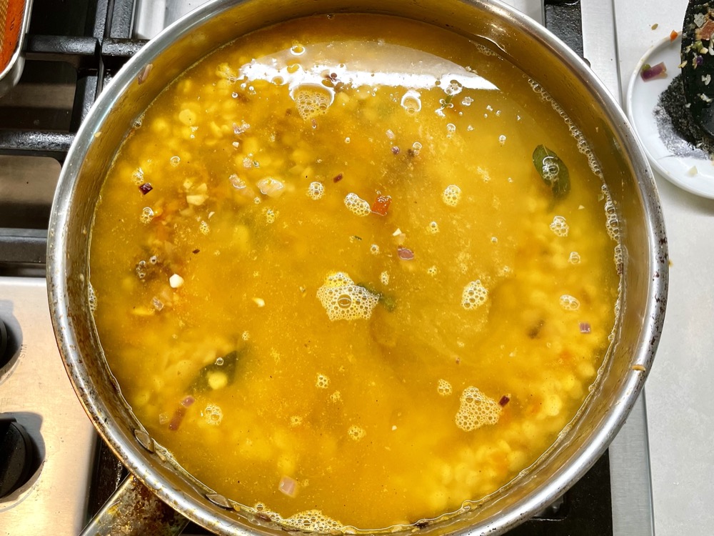 - After 1 hour take off the lid and let the dal continue to simmer for 30 minutes to reduce the liquid. The dal has finished cooking when it looks like a porridge-consistency and the liquid has reduced to your liking.