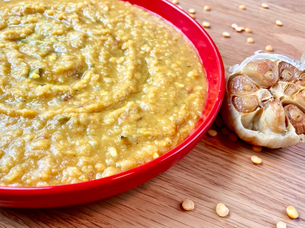 - Mash the roasted garlic cloves (from step 1) and add it into the dal. Taste and adjust salt as needed. Done! Serve over a bed of basmati rice or with naan.