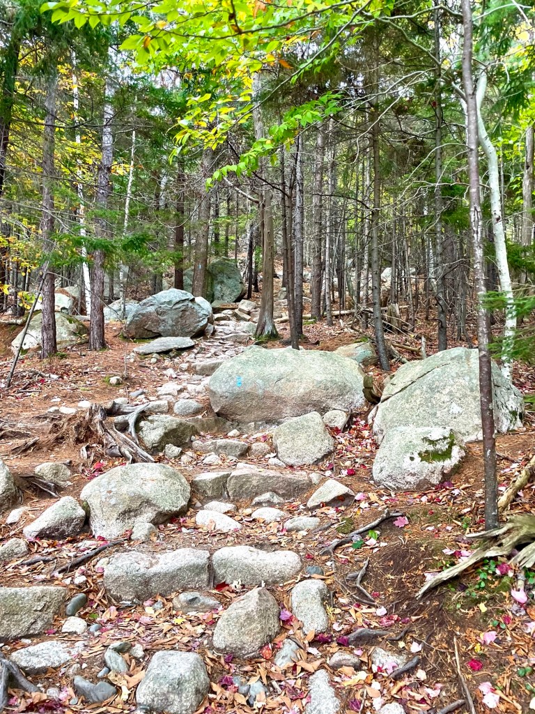 Follow the beach and you’ll reach a sign on the left that points to the Bubbles Divide Trail where you’ll make your way up again. Note: this trail was under construction when we went, so we continued on the Jordan Pond Path along the water until we reached the Bubbles Trail, where we did an out-and-back to the South Bubble summit (our detour is shown in pink dots on the map).