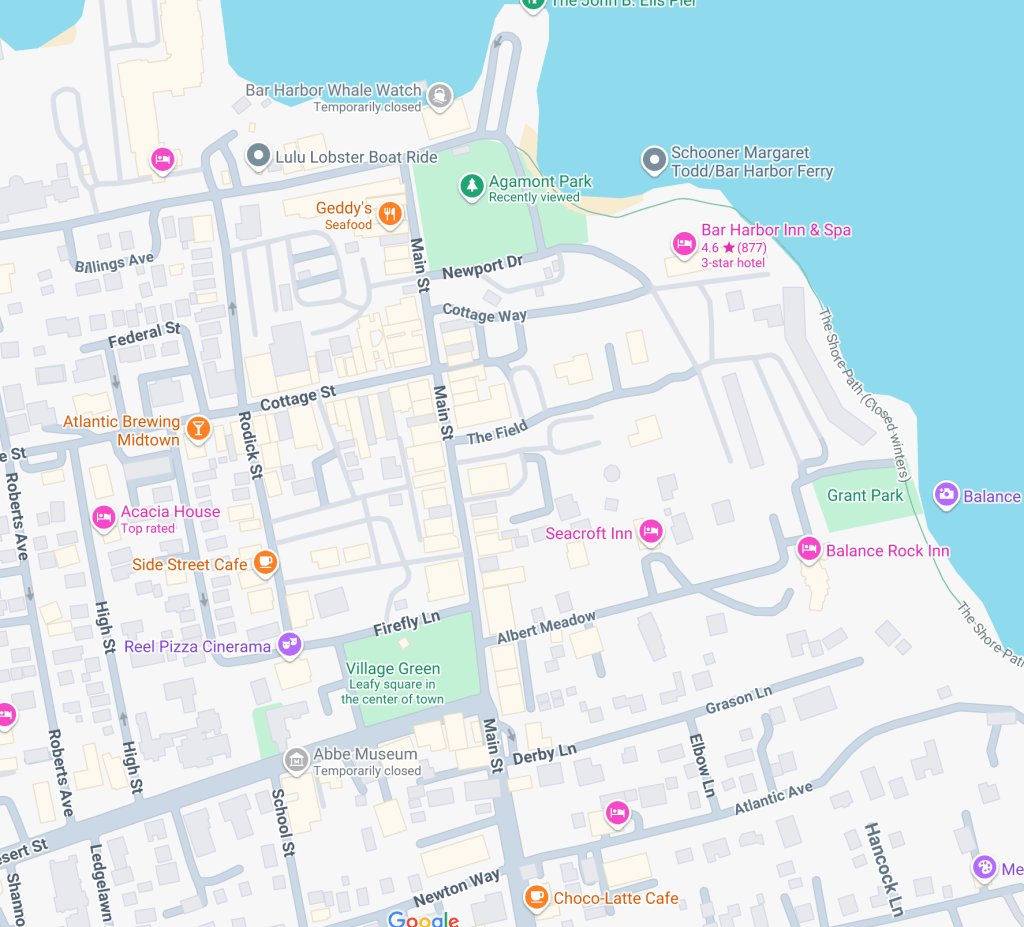 The best place (although more expensive) to stay will be in Bar Harbor town, inside Acadia National Park. Although a small town, it’s got everything you need at your fingertips, including restaurants, shops, grocery stores, bars…etc. It’s also close to the major attractions in the national park as well. I’ve included a screen cap below of available options in Bar Harbor from booking.com for reference. The downtown area is very walkable, so choose to stay closer to Main Street if you want to be in the hustle and bustle. Read more about Bar Harbor below.