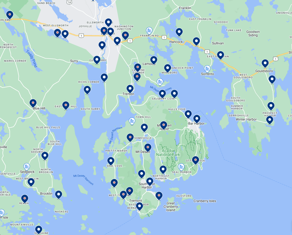 There are a TON of accommodation options around Acadia National Park. You pass by motel after motel the closer you get to Acadia but with that being said, ALL OF IT WILL GET BOOKED UP EARLY. We’ve never encountered such a busy place in our travels before. A month before planning our trip, every single (affordable) accommodation option was booked up around the national park and we snagged the only affordable one remaining all the way in Surry, a 45 mins drive from the park. Although it meant that we had to wake up earlier than planned to get to where we wanted to go, we were just grateful to get a place at all! We travelled at peak season in middle of October, so if you’re planning to do the same, BOOK EARLY. I’ve included a map of available accommodation options from booking.com for the middle of October next year as reference.