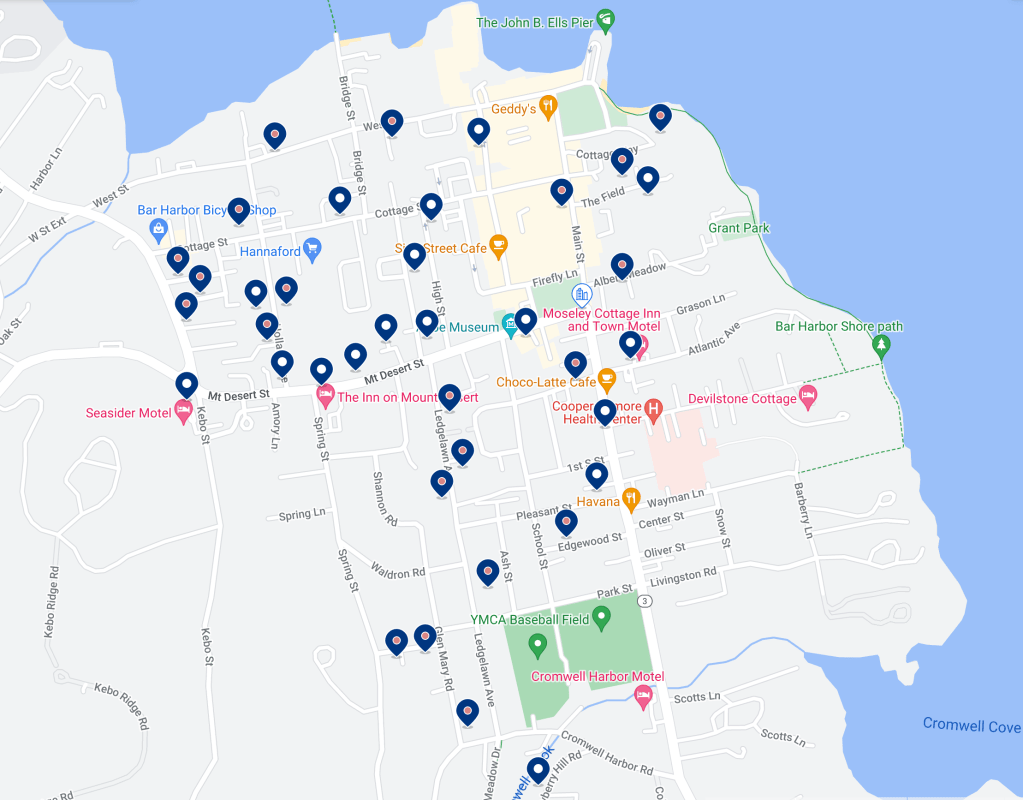 Although an island, Mount Desert Island is accessible by car via Bar Harbor Road. The most popular things to do are on the East side of the island, including exploring Bar Harbor downtown, Sand Beach, hiking the Beehive Trail, Thunder Hole, Ocean Path, Jordan Pond, the ‘Bubbles’, and Cadillac Mountain. I’ve made a quick map of these places below to give you a rough idea of the proximity of the main attractions. I’ll go into each place in more detail further down in this post.