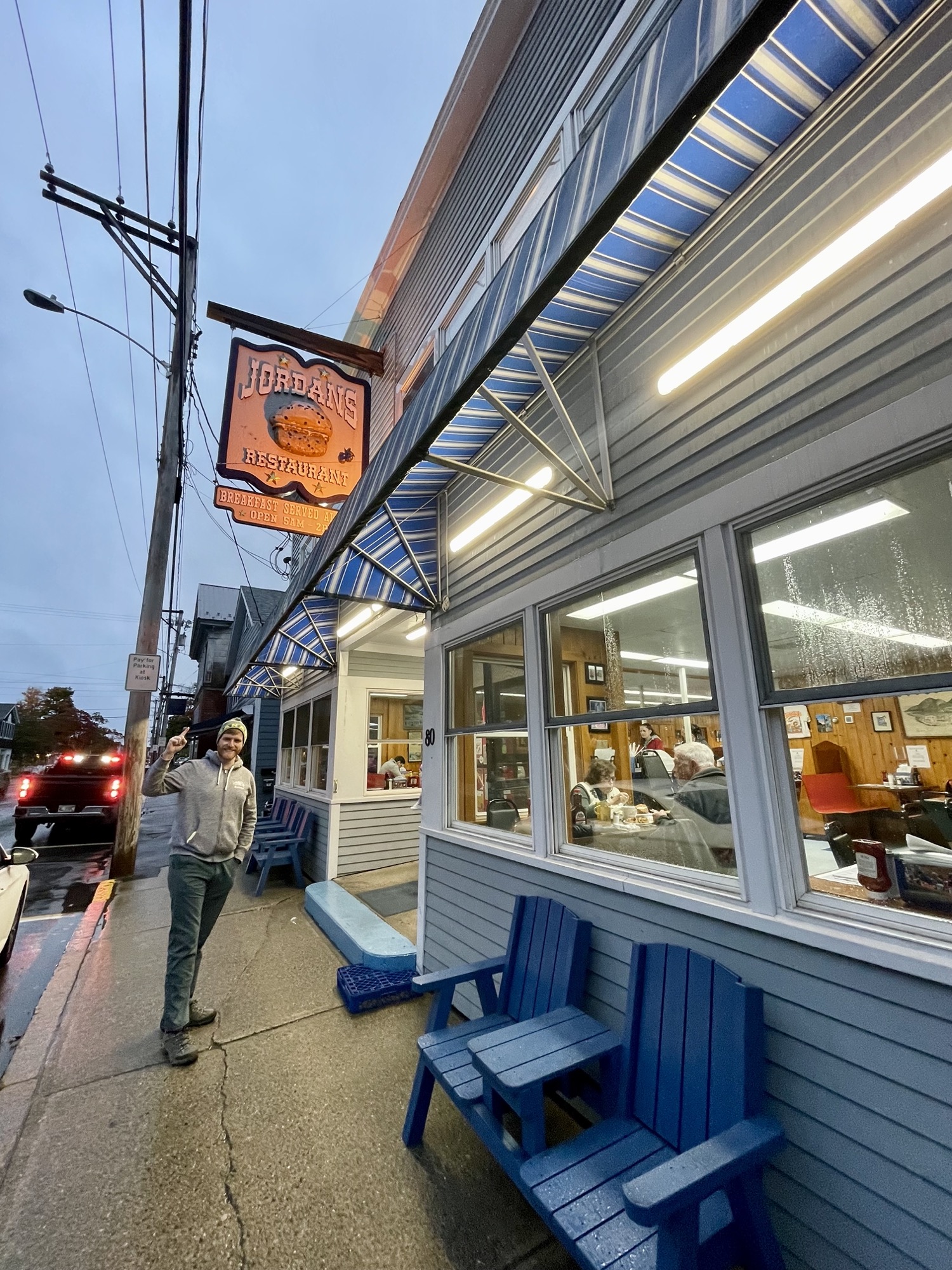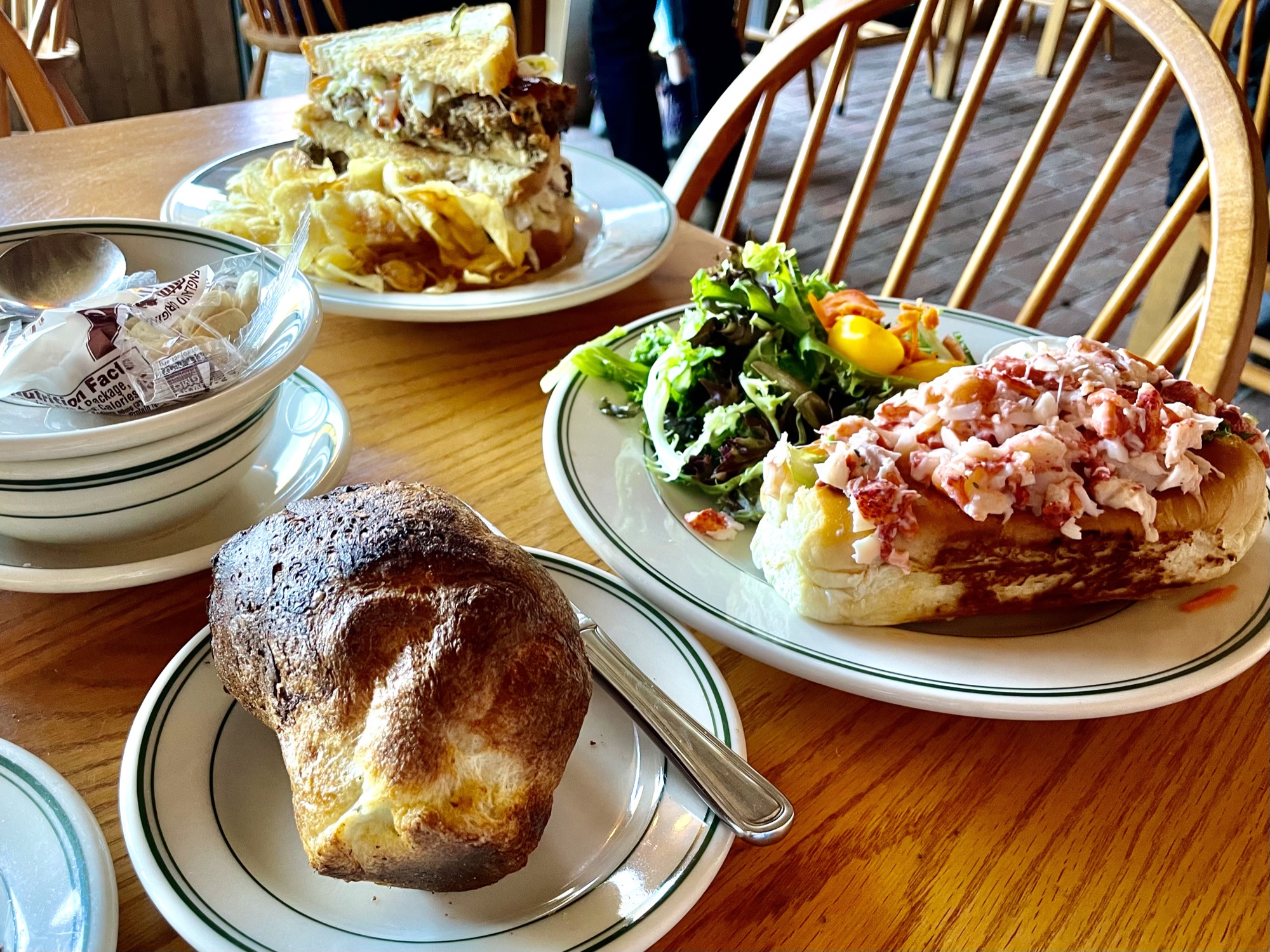 We had breakfast at a highly rated local diner called Jordans Restaurant (conveniently located next to Hannfords). They open at 5am, which was perfect for us after our big disappointment with the gloomy weather on Cadillac Mountain. When we arrived at 7am, the diner was already half full. By the time we left an hour later, there was a line up out the door! They have a decent sized menu, boasting their wild blueberry muffin and wild blueberry pancakes – we got both (and Toby added chocolate chips to the pancake). We also got the lobster roll, clam chowder, and lobster cheese omelette – if you haven’t noticed, we often order too much food because I want to try it all 😅. Overall it was an okay meal. I liked the home fries and the lobster roll was great (soft fluffy toasted buttered bun). The pancakes with the wild blueberry sauce was good but the lobster omelette and blueberry muffin was just okay. The staff was real friendly and the place had a great buzz about it.