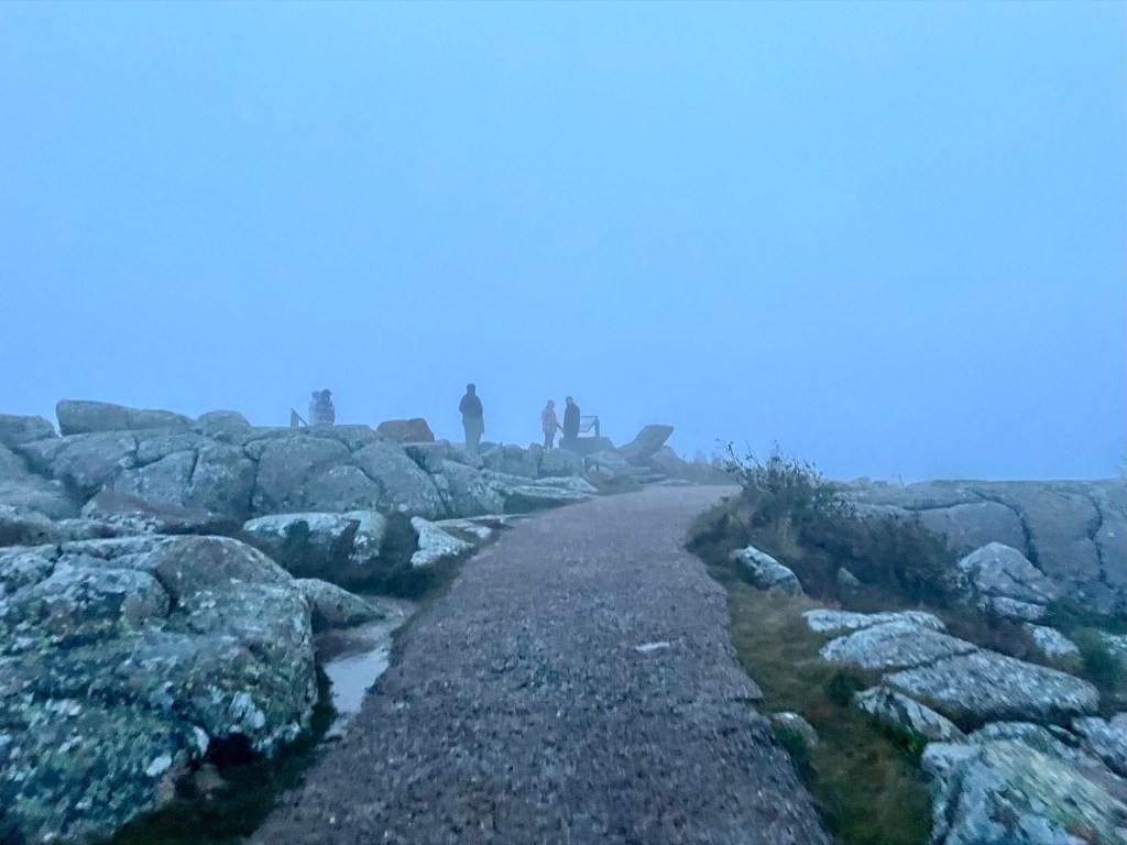 Sadly for us, we did everything right, but the weather was not in our favour. We woke up super early and got to the gate entry at 6:20am, about 20 mins before sunrise (a bit late). We knew visibility was going to be poor, but we had hopes of a small break in the clouds for the views so we drove up anyway – after all, we were already there and the $6 was spent. They scanned our QR code at the gate and it only took us 15 minutes to drive to the top (although I’ve heard it can take up to 30 mins due to slower people unfamiliar with driving up mountain roads and it’s single file all the way up). Once we got to the top, there are 2 parking lots. You’ll pass the smaller West lot first which is farther away (seems like the overflow lot), then you’ll reach the East lot, which is a semi-circle and is directly in front of the trail. You want to park in the East lot. When we visited, the weather was so bad that you could barely see 10 feet in front of you so we just got out to have a quick peak, then got back into our car and headed straight for a warm breakfast in Bar Harbor.