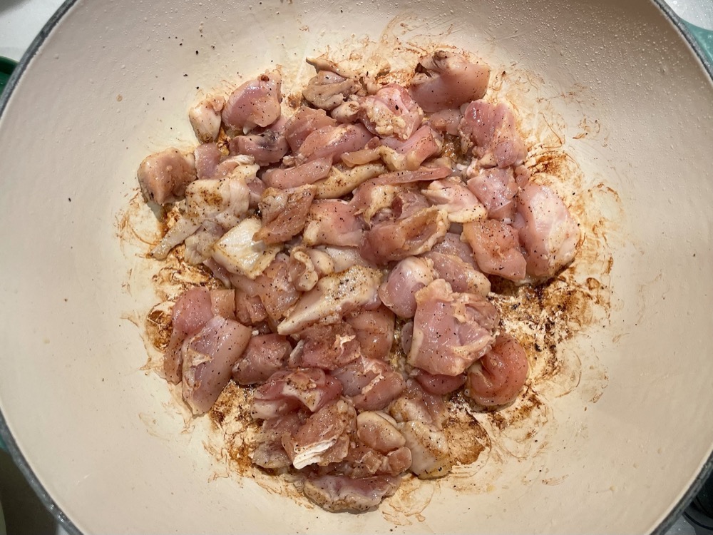 In the same pan, add in the marinated diced chicken (from step 1) and sear both sides until lightly brown, about 1-2 minutes per side. You don’t want to fully cook the chicken at this time. When browned, remove from the pan and set aside.