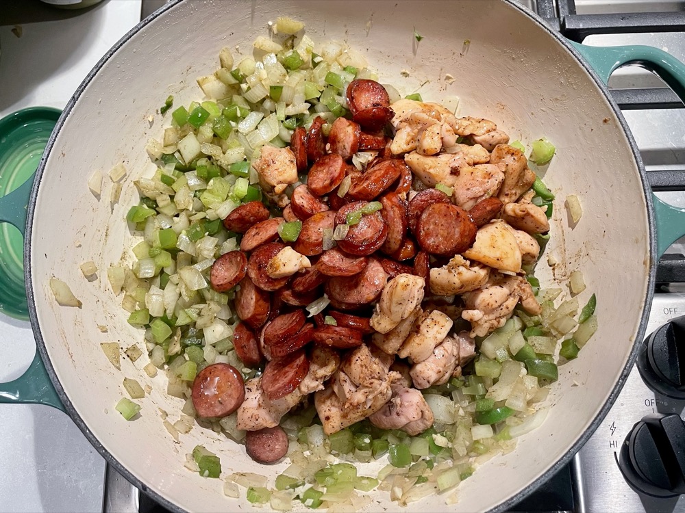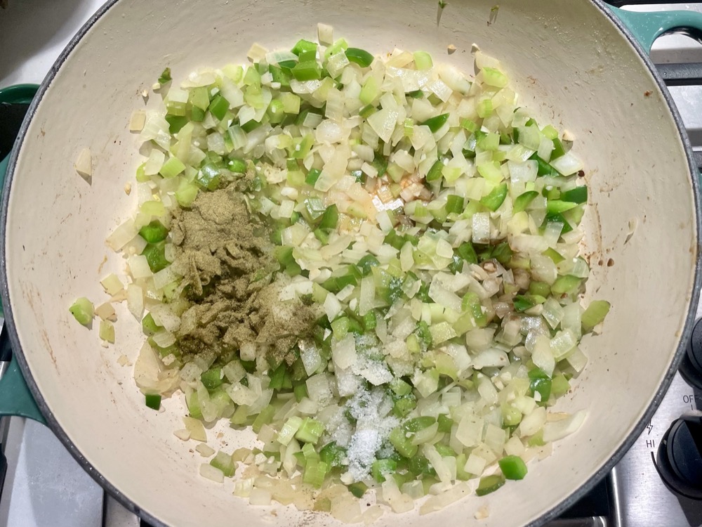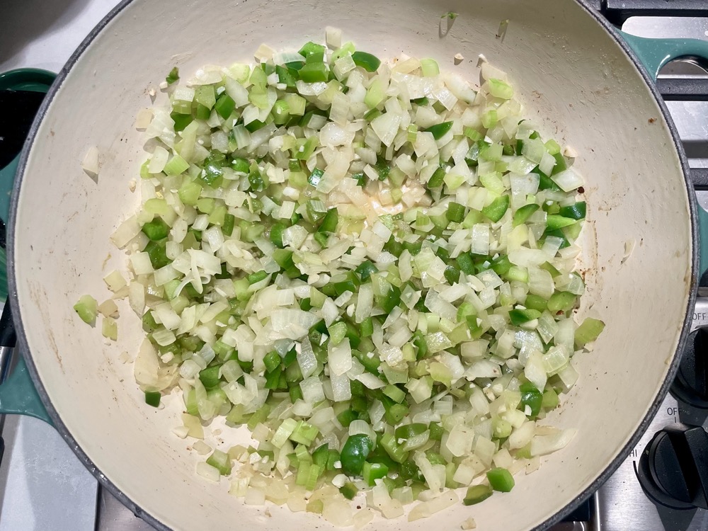 Still in the same pan, add in the garlic, onion, green bell pepper, and celery. Sauté for 5-8 minutes until the vegetables are soft.