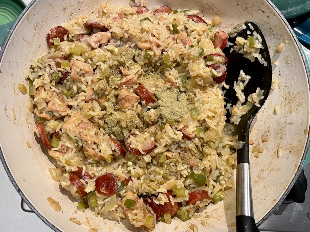 Once the rice is cooked, turn off the heat, mix in another 0.5 tsp gumbo filé, taste and adjust salt as needed.