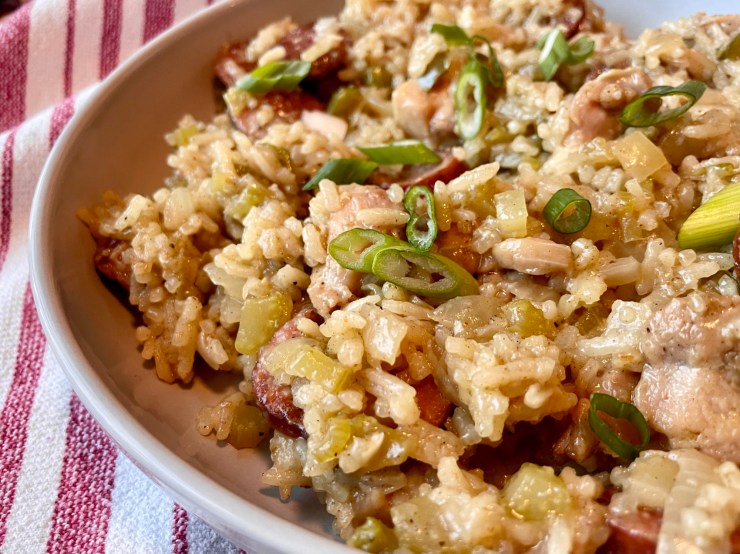 Jambalaya is a savoury rice dish often made with chicken and Andouille sausage, but can contain any variety of proteins. It’s a staple in Louisiana cuisine and is very similar to gumbo in terms of flavour (think of this as a rice version to the stew). The ingredients to both of these dishes are so similar that when I’m making one, I’ll usually make the other 😅. To best describe Jambalaya as a dish, I’d say it’s like an earthy rustic paella – which is not surprising since it has roots from both Spanish and French cuisines.