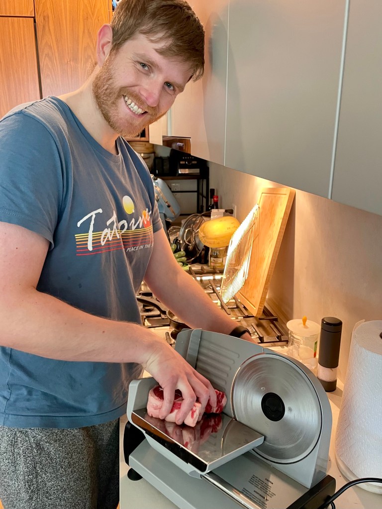 Although more expensive, rib eye steak is the go-to choice for a Philly cheesesteak. It’s a good quality cut with enough marbled fat to give it extra flavour. A cheaper alternative is skirt steak. The steak needs to be very thinly sliced to achieve the right texture, so you can either slice it yourself if you happen to have a deli meat slicer at home (we just got one recently!), freeze the steak for 20 minutes to firm up the beef to make it easier to slice by hand with a knife, or ask your butcher to slice it for you. Another alternative is to buy the pre-sliced frozen beef at Asian grocery stores in the hotpot freezer section.